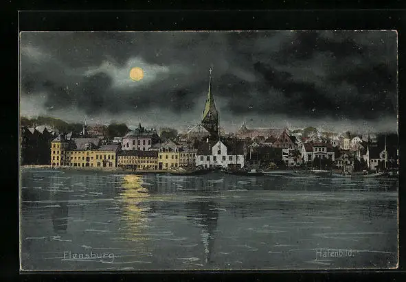 AK Flensburg, Hafenbild bei Mondschein