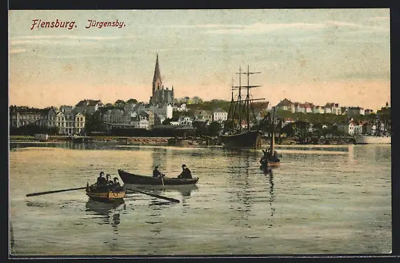 AK Flensburg, Jürgensby mit Booten und Blick auf die Stadt