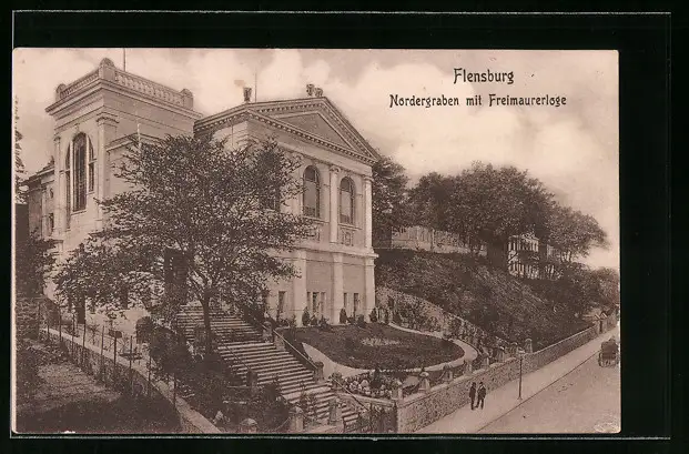 AK Flensburg, Nordergraben mit Freimaurerloge, Freimaurer