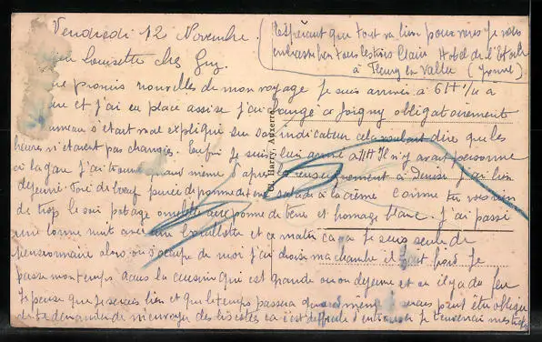 Personenbezogene Daten auf der Rückseite der Karte wurden durch blauen Textmarker unkenntlich gemacht. Die blauen Stellen sind auf die Vorderseite durchgeweicht und wirken sich negativ auf das Postkartenfoto aus