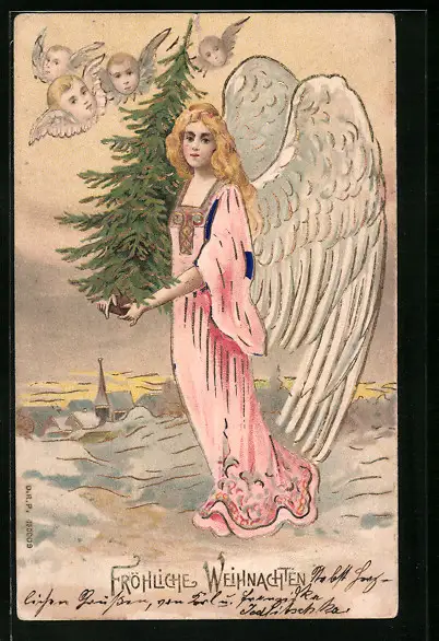 AK Fliegende Engelsköpfe blicken auf einen Weihnachtsengel mit Tannenbaum