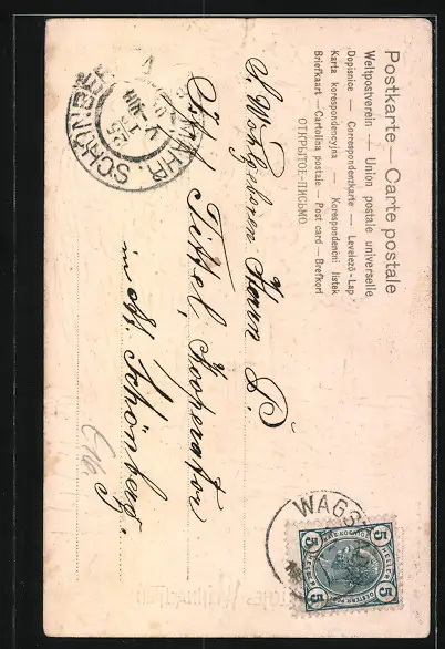Personenbezogene Daten auf der Rückseite der Karte wurden durch blauen Textmarker unkenntlich gemacht. Die blauen Stellen sind auf die Vorderseite durchgeweicht und wirken sich negativ auf das Postkartenfoto aus