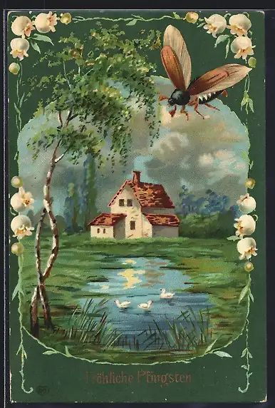 AK Fliegender Maikäfer vor Frühlingsidylle, Maiglöckchen, Pfingstgruss