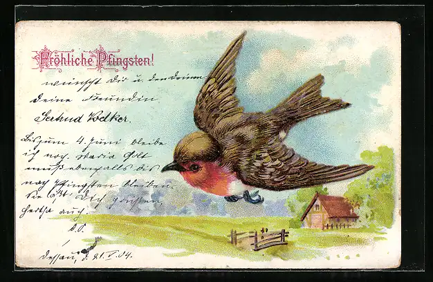 AK Fliegendes Rotkehlchen, Pfingstgruss