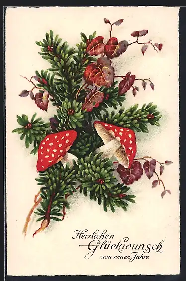 AK Fliegenpilze mit Tannenzweig und Herbstlaub