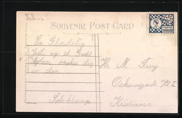 Personenbezogene Daten auf der Rückseite der Karte wurden durch blauen Textmarker unkenntlich gemacht. Die blauen Stellen sind auf die Vorderseite durchgeweicht und wirken sich negativ auf das Postkartenfoto aus