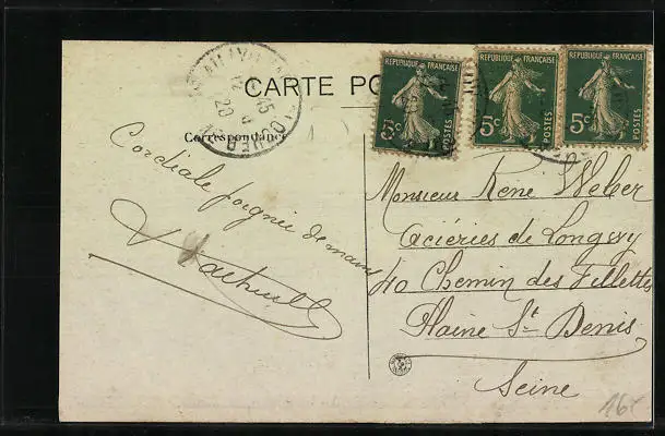 Personenbezogene Daten auf der Rückseite der Karte wurden durch blauen Textmarker unkenntlich gemacht. Die blauen Stellen sind auf die Vorderseite durchgeweicht und wirken sich negativ auf das Postkartenfoto aus