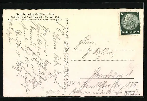 AK Flöha /Sa., Bahnhof, Aussenansicht mit Terrasse und Strasse