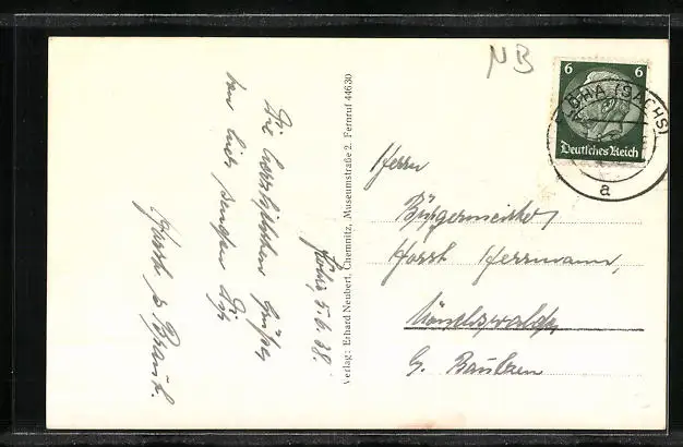 gelaufen 1938, kleiner Einriss li. mittig, guter Zustand