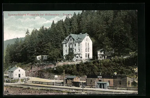 AK Flossplatz b. Wolkenstein, Warmbad Flossplatz und Häuser am Berg