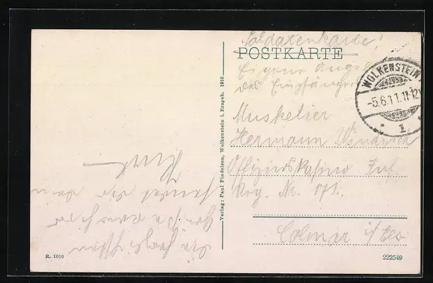Personenbezogene Daten auf der Rückseite der Karte wurden durch blauen Textmarker unkenntlich gemacht. Die blauen Stellen sind auf die Vorderseite durchgeweicht und wirken sich negativ auf das Postkartenfoto aus
