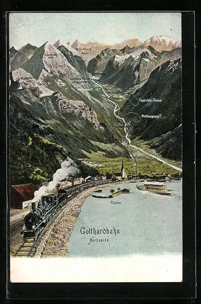 AK Flüelen, Gotthardbahn-Linie von der Nordseite gesehen