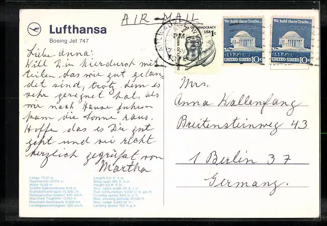 AK Flugzeug Boeing Jet 747 der Lufthansa am Himmel