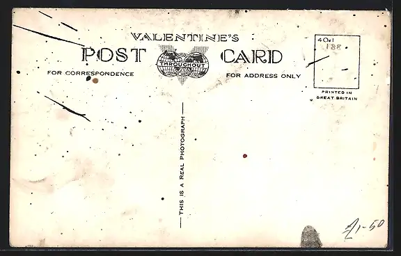 Personenbezogene Daten auf der Rückseite der Karte wurden durch blauen Textmarker unkenntlich gemacht. Die blauen Stellen sind auf die Vorderseite durchgeweicht und wirken sich negativ auf das Postkartenfoto aus