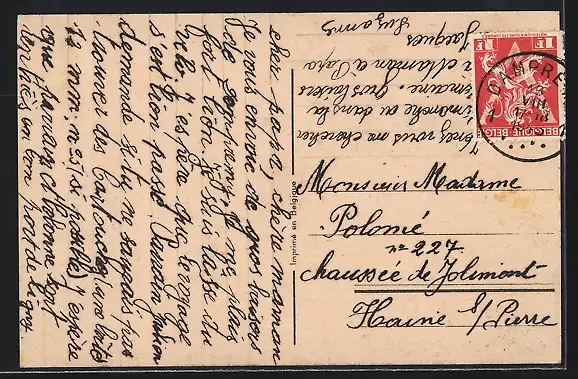 Personenbezogene Daten auf der Rückseite der Karte wurden durch blauen Textmarker unkenntlich gemacht. Die blauen Stellen sind auf die Vorderseite durchgeweicht und wirken sich negativ auf das Postkartenfoto aus