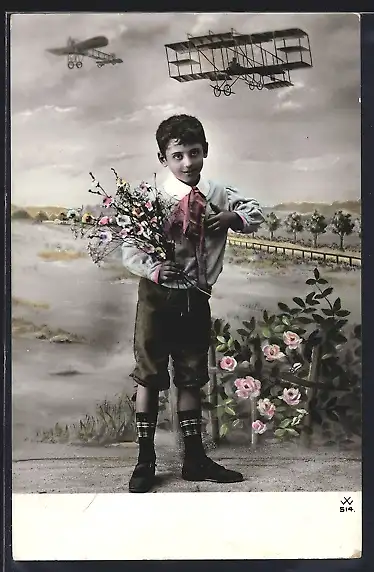 AK Flugzeuge über einem Knaben mit Blumenstrauss