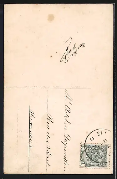 Personenbezogene Daten auf der Rückseite der Karte wurden durch blauen Textmarker unkenntlich gemacht. Die blauen Stellen sind auf die Vorderseite durchgeweicht und wirken sich negativ auf das Postkartenfoto aus