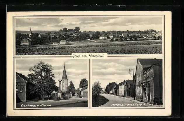 AK Flurstedt, Strassenpartie mit Materialwarenhandlung, Denkmal u. Kirche, Ortsansicht