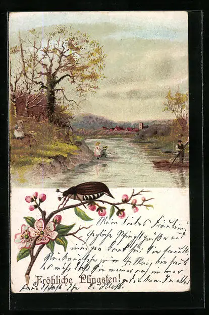 AK Flusspartie und Maikäfer auf Blütenzweig, Pfingstgruss