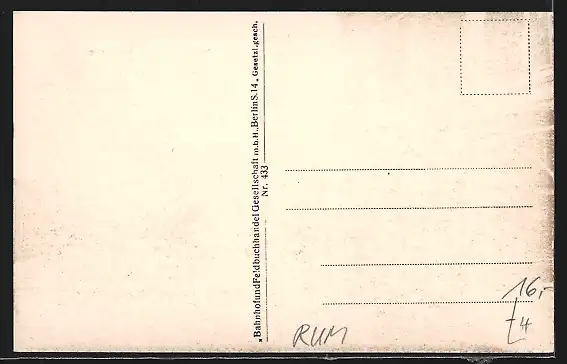 Personenbezogene Daten auf der Rückseite der Karte wurden durch blauen Textmarker unkenntlich gemacht. Die blauen Stellen sind auf die Vorderseite durchgeweicht und wirken sich negativ auf das Postkartenfoto aus