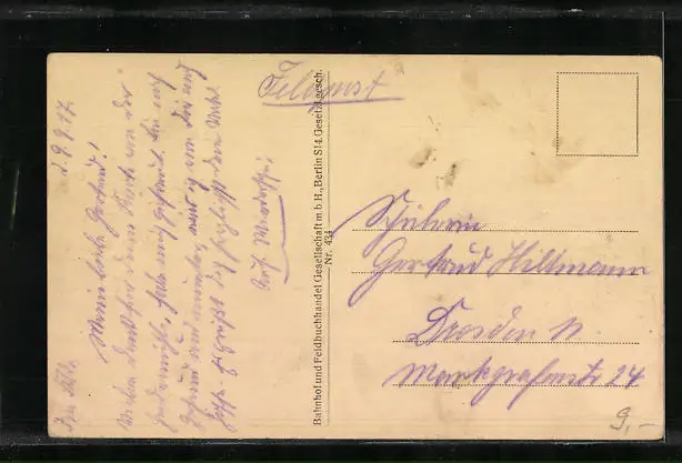 Personenbezogene Daten auf der Rückseite der Karte wurden durch blauen Textmarker unkenntlich gemacht. Die blauen Stellen sind auf die Vorderseite durchgeweicht und wirken sich negativ auf das Postkartenfoto aus