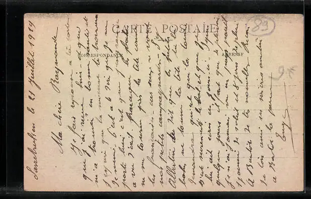 Personenbezogene Daten auf der Rückseite der Karte wurden durch blauen Textmarker unkenntlich gemacht. Die blauen Stellen sind auf die Vorderseite durchgeweicht und wirken sich negativ auf das Postkartenfoto aus