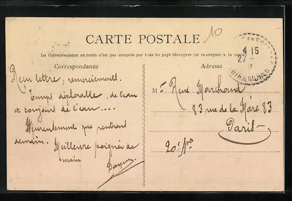 Personenbezogene Daten auf der Rückseite der Karte wurden durch blauen Textmarker unkenntlich gemacht. Die blauen Stellen sind auf die Vorderseite durchgeweicht und wirken sich negativ auf das Postkartenfoto aus