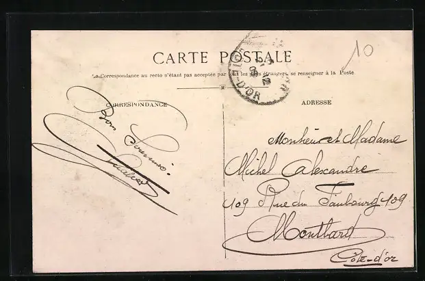 Personenbezogene Daten auf der Rückseite der Karte wurden durch blauen Textmarker unkenntlich gemacht. Die blauen Stellen sind auf die Vorderseite durchgeweicht und wirken sich negativ auf das Postkartenfoto aus