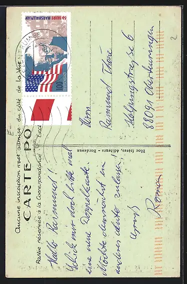Personenbezogene Daten auf der Rückseite der Karte wurden durch blauen Textmarker unkenntlich gemacht. Die blauen Stellen sind auf die Vorderseite durchgeweicht und wirken sich negativ auf das Postkartenfoto aus