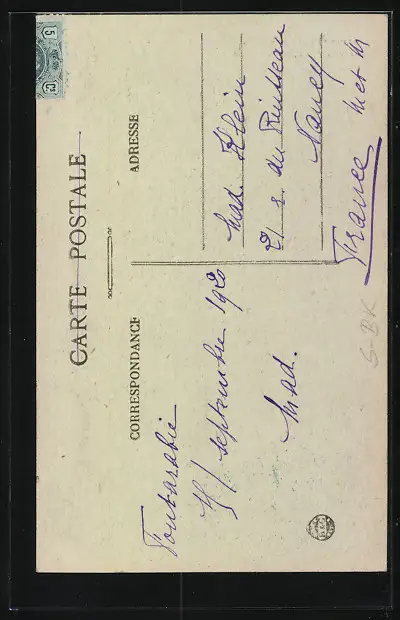 Personenbezogene Daten auf der Rückseite der Karte wurden durch blauen Textmarker unkenntlich gemacht. Die blauen Stellen sind auf die Vorderseite durchgeweicht und wirken sich negativ auf das Postkartenfoto aus