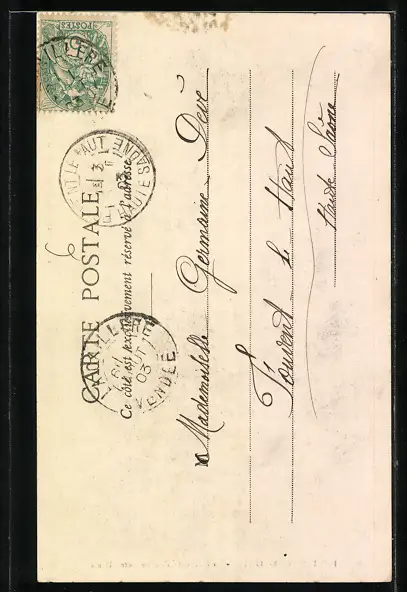 Personenbezogene Daten auf der Rückseite der Karte wurden durch blauen Textmarker unkenntlich gemacht. Die blauen Stellen sind auf die Vorderseite durchgeweicht und wirken sich negativ auf das Postkartenfoto aus