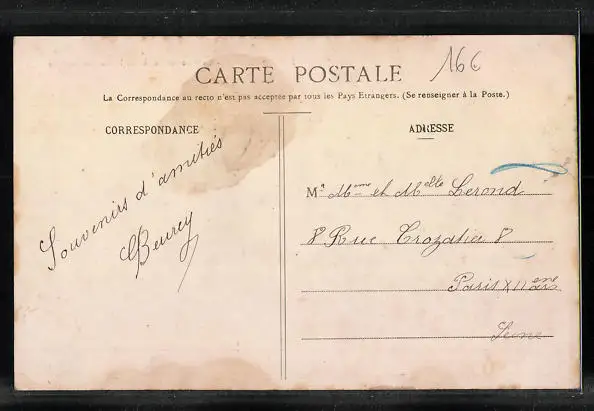 Personenbezogene Daten auf der Rückseite der Karte wurden durch blauen Textmarker unkenntlich gemacht. Die blauen Stellen sind auf die Vorderseite durchgeweicht und wirken sich negativ auf das Postkartenfoto aus