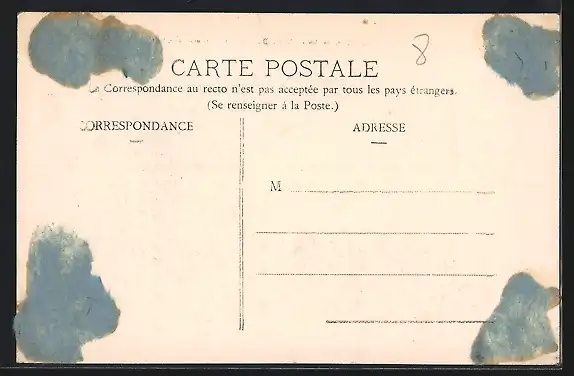 Personenbezogene Daten auf der Rückseite der Karte wurden durch blauen Textmarker unkenntlich gemacht. Die blauen Stellen sind auf die Vorderseite durchgeweicht und wirken sich negativ auf das Postkartenfoto aus