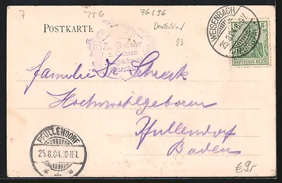 alte Ansichtskarte, gelaufen 1904, Eckknick oben li., Stempelspur, guter Zustand