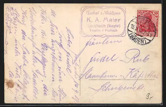 Personenbezogene Daten auf der Rückseite der Karte wurden durch blauen Textmarker unkenntlich gemacht. Die blauen Stellen sind auf die Vorderseite durchgeweicht und wirken sich negativ auf das Postkartenfoto aus