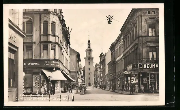 AK Forst i. Lausitz, Cottbuser Strasse mit Stadtkirche