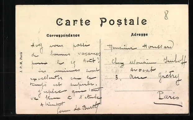 Personenbezogene Daten auf der Rückseite der Karte wurden durch blauen Textmarker unkenntlich gemacht. Die blauen Stellen sind auf die Vorderseite durchgeweicht und wirken sich negativ auf das Postkartenfoto aus