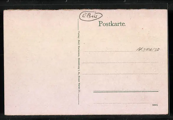 Personenbezogene Daten auf der Rückseite der Karte wurden durch blauen Textmarker unkenntlich gemacht. Die blauen Stellen sind auf die Vorderseite durchgeweicht und wirken sich negativ auf das Postkartenfoto aus