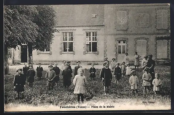 AK Fouchères /Yonne, Place de la Mairie avec des enfants rassemblés devant le bâtiment administratif
