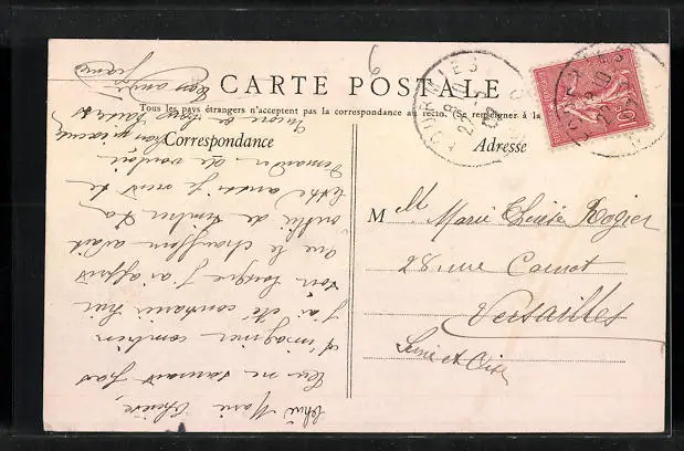 Personenbezogene Daten auf der Rückseite der Karte wurden durch blauen Textmarker unkenntlich gemacht. Die blauen Stellen sind auf die Vorderseite durchgeweicht und wirken sich negativ auf das Postkartenfoto aus