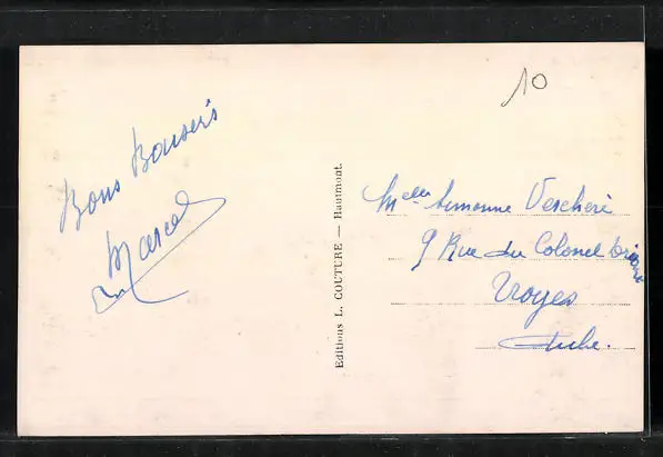 Personenbezogene Daten auf der Rückseite der Karte wurden durch blauen Textmarker unkenntlich gemacht. Die blauen Stellen sind auf die Vorderseite durchgeweicht und wirken sich negativ auf das Postkartenfoto aus
