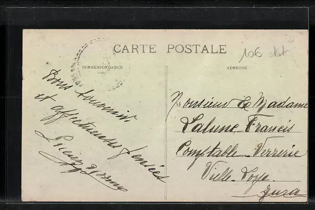 Personenbezogene Daten auf der Rückseite der Karte wurden durch blauen Textmarker unkenntlich gemacht. Die blauen Stellen sind auf die Vorderseite durchgeweicht und wirken sich negativ auf das Postkartenfoto aus