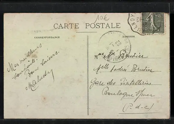 Personenbezogene Daten auf der Rückseite der Karte wurden durch blauen Textmarker unkenntlich gemacht. Die blauen Stellen sind auf die Vorderseite durchgeweicht und wirken sich negativ auf das Postkartenfoto aus