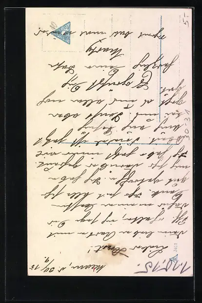 Personenbezogene Daten auf der Rückseite der Karte wurden durch blauen Textmarker unkenntlich gemacht. Die blauen Stellen sind auf die Vorderseite durchgeweicht und wirken sich negativ auf das Postkartenfoto aus