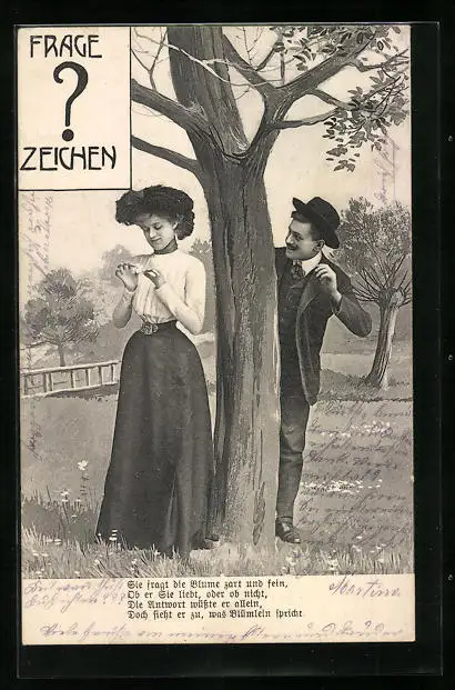 AK Fragezeichen, Frau fragt eine Blume nach der Liebe ihres Verehrers