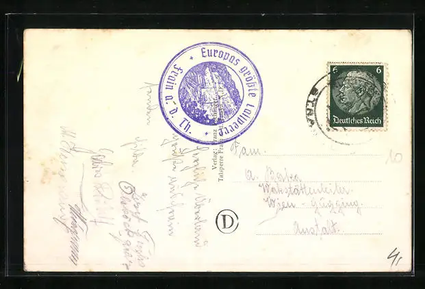 Personenbezogene Daten auf der Rückseite der Karte wurden durch blauen Textmarker unkenntlich gemacht. Die blauen Stellen sind auf die Vorderseite durchgeweicht und wirken sich negativ auf das Postkartenfoto aus
