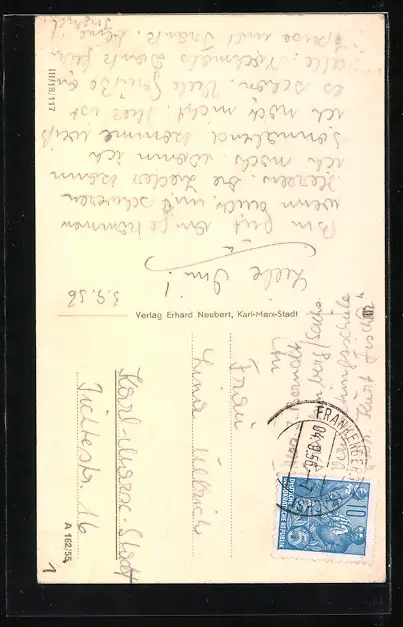 Personenbezogene Daten auf der Rückseite der Karte wurden durch blauen Textmarker unkenntlich gemacht. Die blauen Stellen sind auf die Vorderseite durchgeweicht und wirken sich negativ auf das Postkartenfoto aus