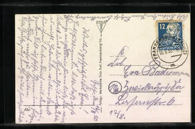 Personenbezogene Daten auf der Rückseite der Karte wurden durch blauen Textmarker unkenntlich gemacht. Die blauen Stellen sind auf die Vorderseite durchgeweicht und wirken sich negativ auf das Postkartenfoto aus