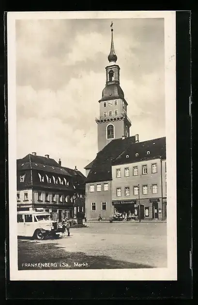 AK Frankenberg i. S., Markt mit Fussgängern und Händler Otto Thomas