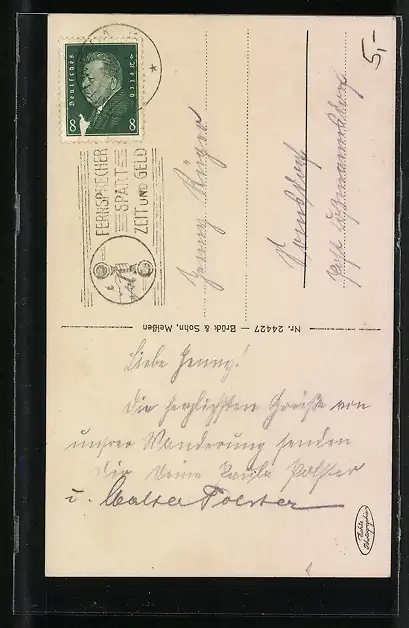 Personenbezogene Daten auf der Rückseite der Karte wurden durch blauen Textmarker unkenntlich gemacht. Die blauen Stellen sind auf die Vorderseite durchgeweicht und wirken sich negativ auf das Postkartenfoto aus